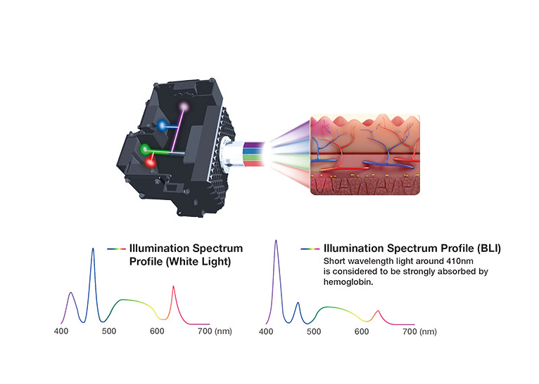 Fokusirajući se na karakteristike apsorpcije hemoglobina kratke talasne dužine (na 410 nm), BLI emituje visok odnos intenziteta plavo-ljubičaste svetlosti, da bi pomogao visokokontrastno snimanje mikrosudova.